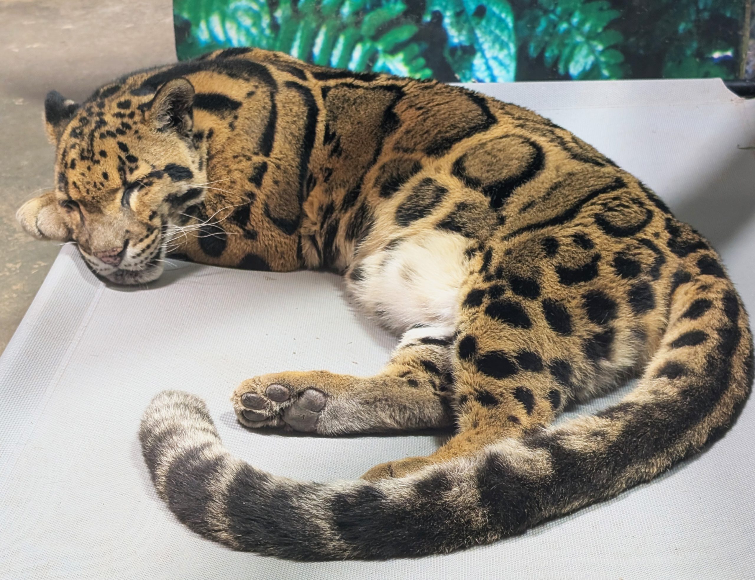Photographed at a zoological facility, March 25, 2026. The subject was curled and resting on an elevated platform in an indoor enclosure with a tropical rainforest mural backdrop — a common setup for clouded leopards, which are highly stress-sensitive and rarely put themselves on display for visitors. What struck me first was the sheer scale of the paws and the tail: the tail wrapped nearly full-circle around the body, and the feet were enormous relative to the frame — you could really understand the arboreal design in a glance. The cloud rosettes were more dramatic in person than any photo communicates — thick, irregular dark borders with slightly darker centers against warm tawny fur.
