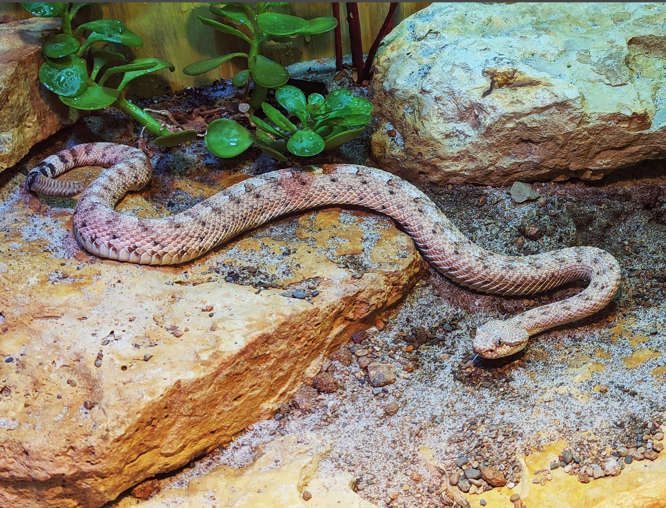 - The animal is displayed on a sand-and-rock desert setup with sparse greenery—very consistent with sidewinder habitat aesthetics.