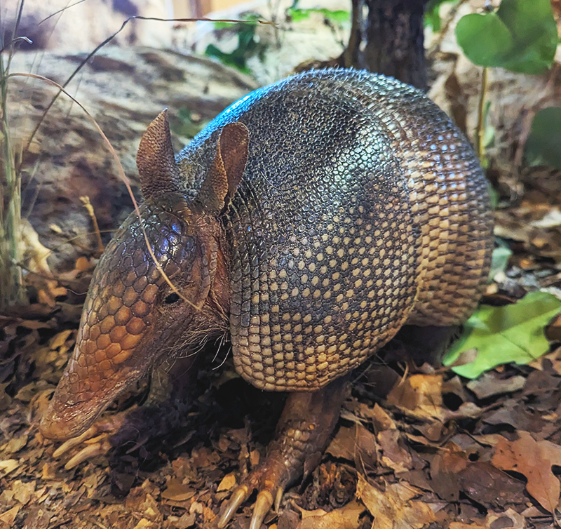 Covered in a tough carapace composed of bony plates (osteoderms) overlaid with keratinized scales. The characteristic nine flexible bands across the midsection allow limited bending and movement. Coloration ranges from gray-brown to yellowish-brown, often blending seamlessly with leaf litter and soil.