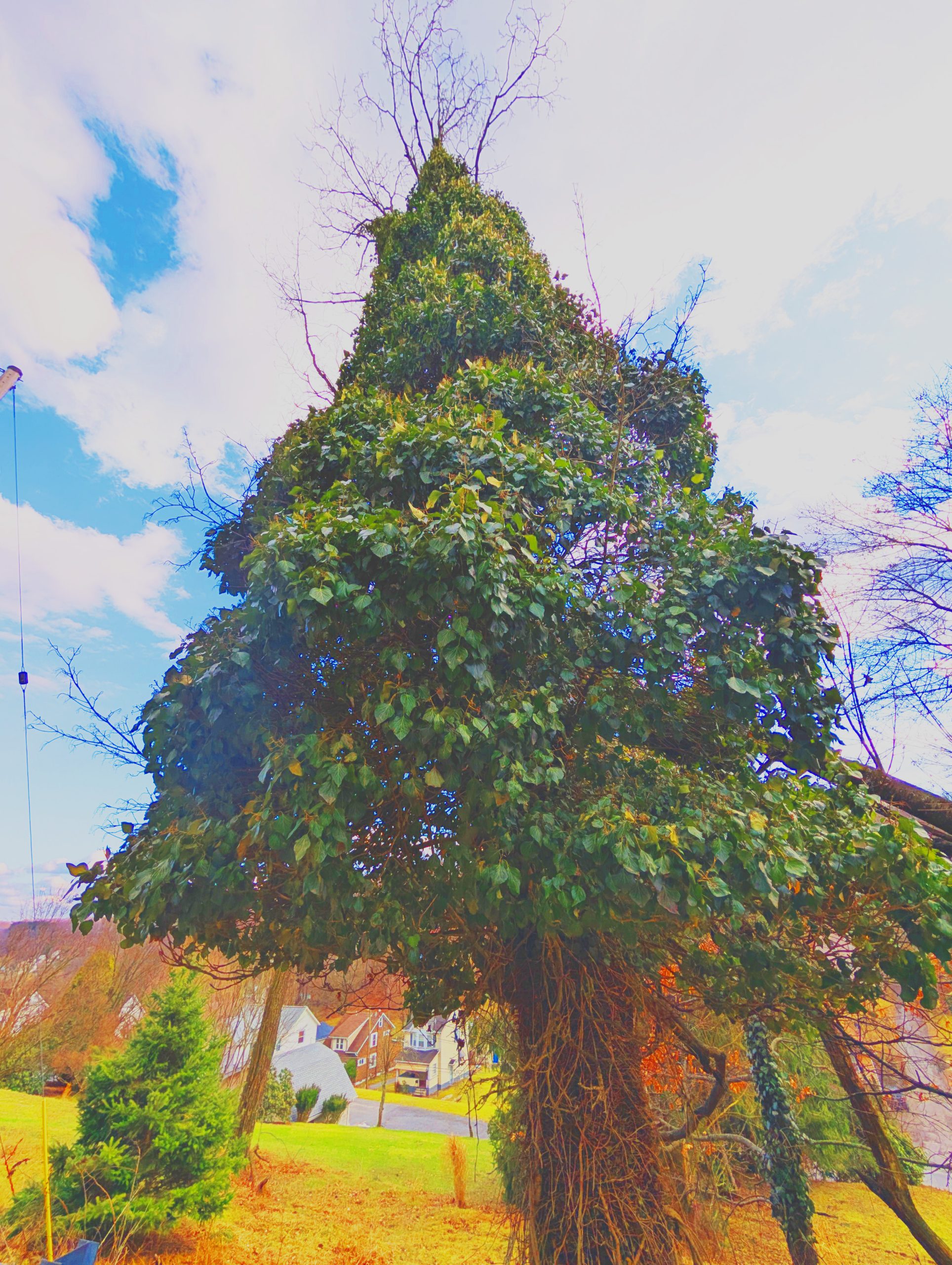 The dark green mass in the middle of the tree is not the tree’s foliage at all. It is the ivy forming a dense secondary crown, intercepting sunlight before it can reach the tree’s own lower limbs.