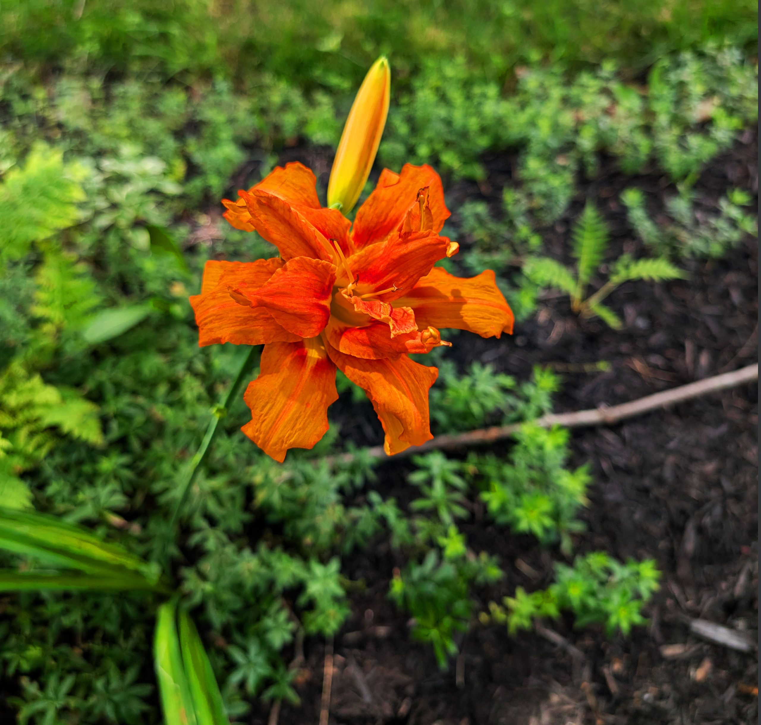 Hemerocallis fulva ‘Kwanso’ is a clump-forming, herbaceous perennial distinguished by its double and fully double flowers—each bloom with multiple layers of ruffled, orange petals. Foliage is strap-like, arching, and grass-like, forming dense clumps 30–45 cm (12–18 in) tall; floral scapes rise above the foliage.