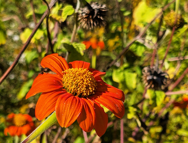 Tithonia rotundifolia is one of the most reliably productive pollinator plants available to the temperate garden. Monarch butterflies, tiger swallowtails, painted ladies, bumblebees, longhorned bees, syrphid flies, and a wide range of other pollinators visit the flowers consistently throughout the bloom season. Few annuals match its combination of visual intensity, drought tolerance, pollinator value, and sheer productivity in the late-summer garden. The genus name Tithonia honors Tithonus of Greek mythology — the mortal lover of the dawn goddess Eos, granted immortality but not eternal youth, who eventually withered into a cicada. The name reflects the plant’s association with heat, light, and the burning colors of sunrise. The cultivar ‘Torch’ has been in commercial production since winning an All-America Selections award in 1951 and remains the most widely available selection.